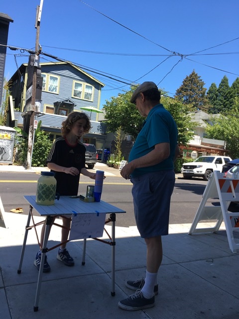 We enjoyed the goodies on a bench in the shade, watching people and traffic go by. A young fella set up a lemonade stand and Grandpa Nelson was his first customer! Other folks soon followed.