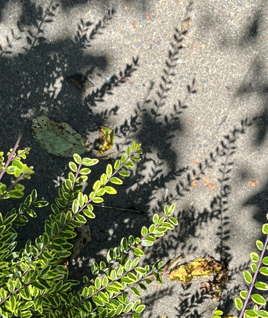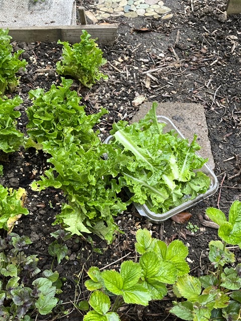 It has been sunny, clear, and in the 70s all week. Brilliant sun brings delightful shadows, as well as harvesting lots of lettuce from the vegetable garden.