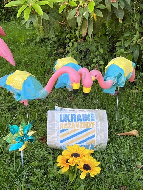 Our local flock of plastic flamingos is out in their yard, showing their support for Ukraine.