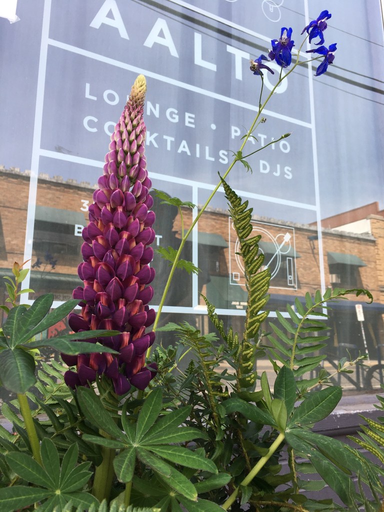 We were happy to see Stumptown Coffee open, and got an iced coffee to help our closest coffee shop. I found the image of the day there, in this magnificent lupine growing out front. The angle of the sun was such that it highlights the Aalto Bar, which isn’t even open now, but that’s the way the photograph clicks sometimes.