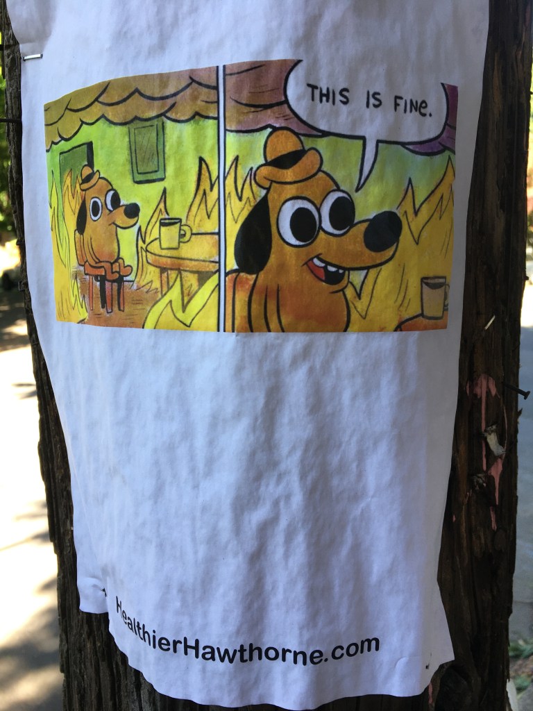 We also found this cartoon by a local artist, posted on a telephone pole, that sort of said it all for me at that moment. Amidst the flames, we sit in our houses and cope. “This is fine,” we say.