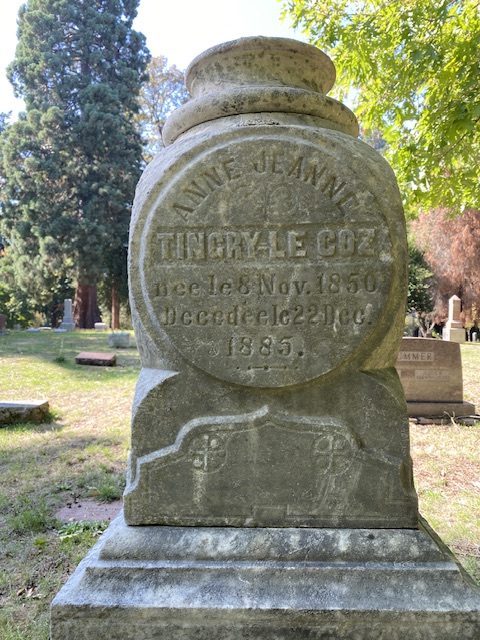 On our walk, I took the map of the tours and we walked around to see if we could find the graves. First on my list was Emma Merlotin, but I couldn’t find her, but Auntie Bridgett took this picture of the headstone ofAnneJean Tingry- Le Coz because of her French origins.
