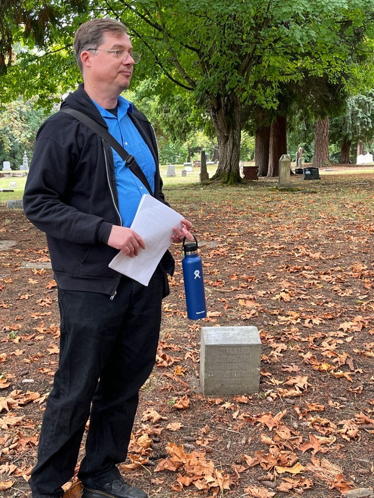 We met up with J Swofford and other volunteers at Lone Fir the other day, for a walk-through of the tour. We got to ‘meet’ such interesting folks as Julius Caesar, a formerly enslaved man who made a name for himself as a political orator for progressive causes. He was also a local baseball fan, and on his tombstone, along with his name and dates, are the words “Play Ball”.