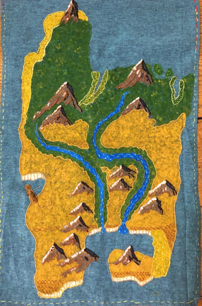 Having painted it “as a first layer”, I needed to figure out the next layer. Lay in the outlines, then stitch some mountains, then… maybe some rapids? Yes, this was coming along.