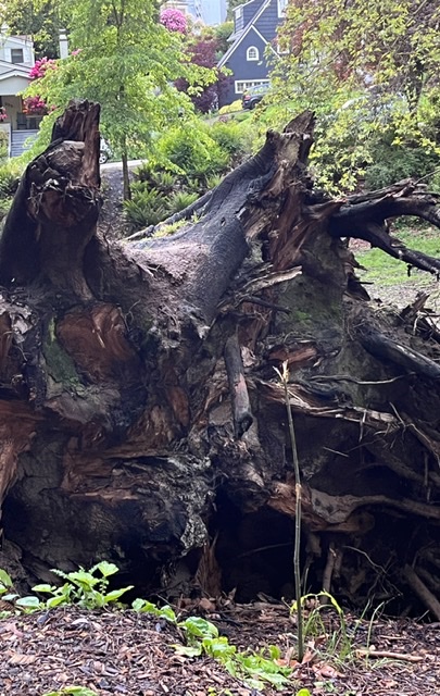 And someone decided that the remaining set of roots should protect a NEW tree, and planted one, right there. We named it Ken.