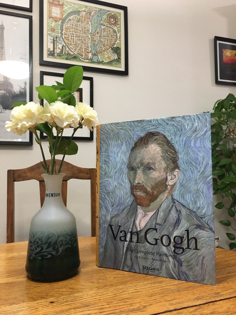 There were lots of prints of Vincent van Gough’s works, and some of them seemed like they could go together. I carefully cut the elements of the cards apart and moved them around.