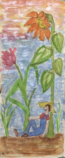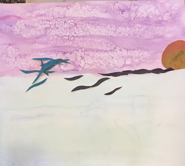 Then we traced the shapes, overlapping them a bit. Ruthie directed us to decide which leaves would be the top layer, and watercolor them a light yellow.