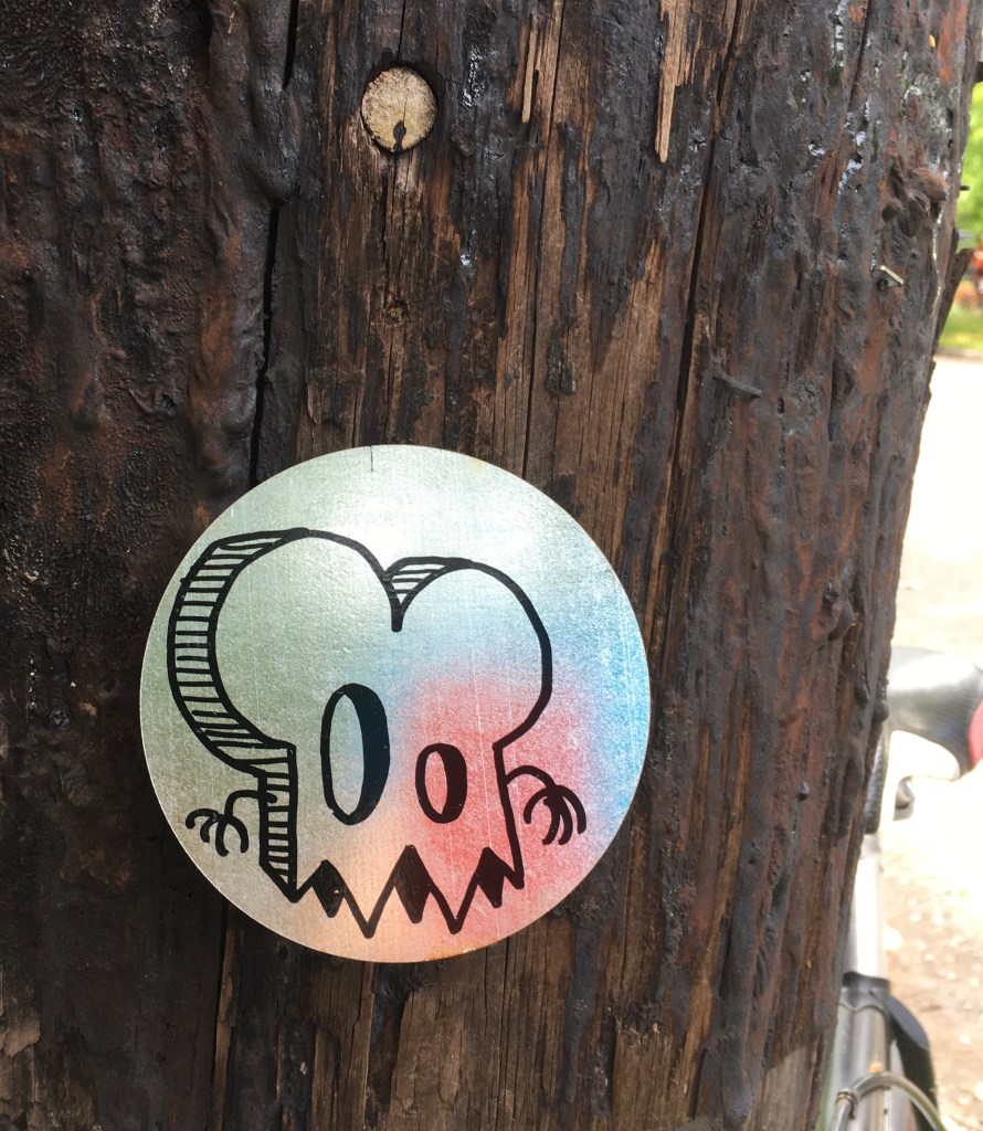 Local artists are making bits to amuse folks. This fellow, who goes by the name “Toast Ghost”, paints images on metal and attaches them magnetically to metal parts of the landscape. We found this one stuck on the bolt of a telephone pole!
