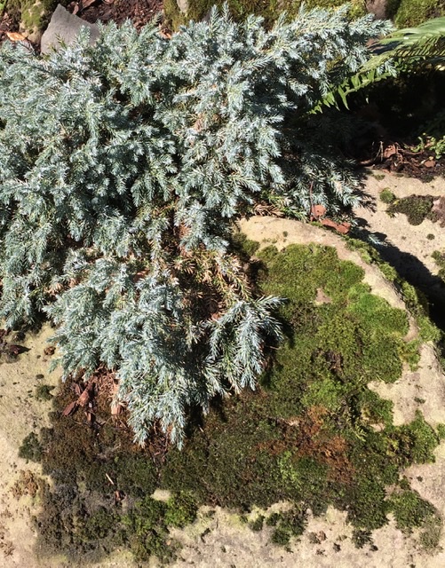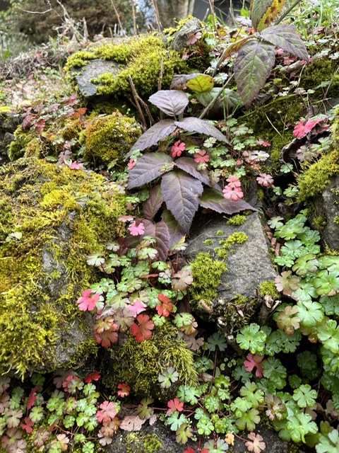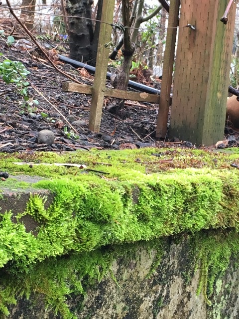 These hundreds of types of moss and lichen are always in the rocks, drying to a flat brown and biding their time during the summer months. But give us a few days of rain, and they green up, send out tiny stems, and look very nice beside the newly sprouting daffodils.