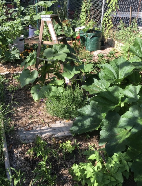 The zucchini plant has spread over the stepping stones, is nudging the lavender and crowding the new ladder I set up for the pumpkin. The whole place looks like it is preparing to run amok.